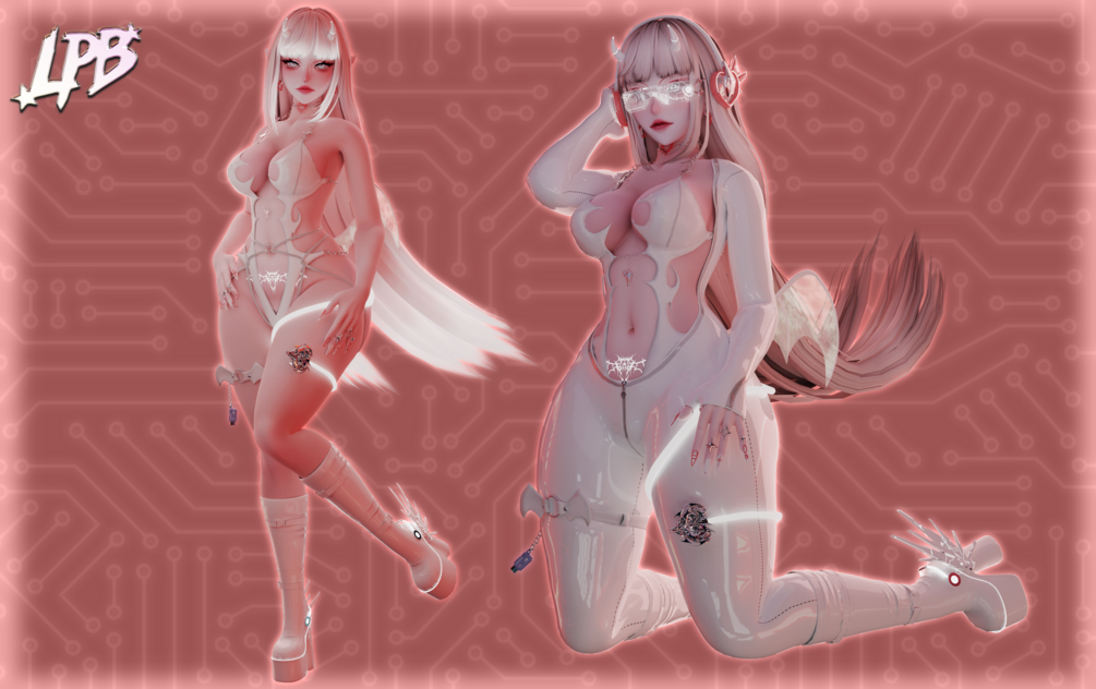 bodysuit, dress, wings, horns, tail, headphones, wire rope , glasses, body texture+tattoo - scratch by me