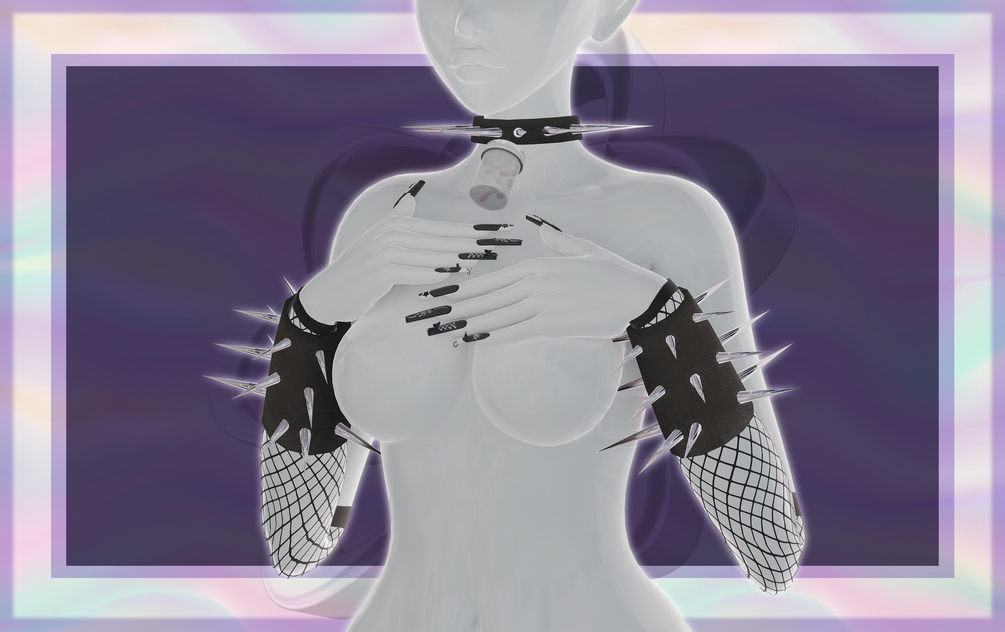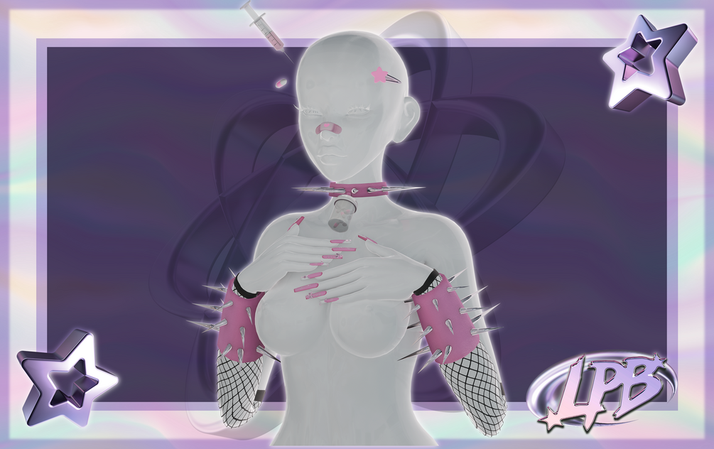 pill bottle choker, pill and star hairclip, head syringe, arm fishnets, arm spike bracelet, nails, nose band aid
