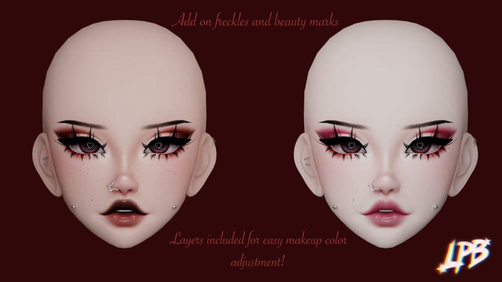 ☆4k scratch makeup textures made in Procreate (brushes used). Includes- 9 skintone PNG, .PSD file w/ layers including freckles, beauty marks. Easily adjust makeup color and style! everything is hand drawn by me<3